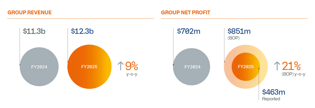 On a reported basis, in 2025, Group Revenue was $12.35b, while Net Profit was $463m, reflecting non-cash impairment losses that were partially offset by gains from portfolio divestments.