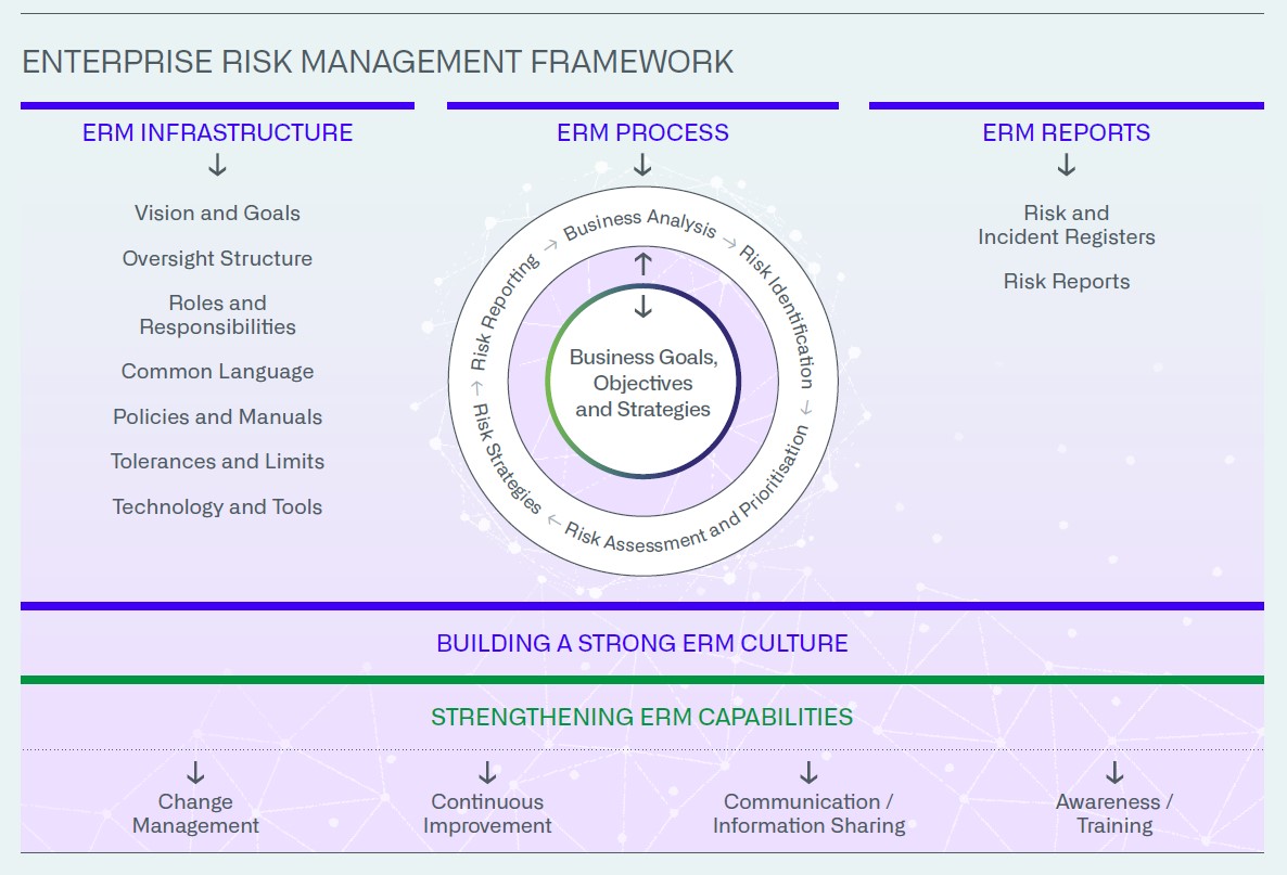We deploy an ERM Framework to identify the key risks that may impede the achievement of our business goals in the short, medium and long-term. It sets out a consistent definition of risk and risk tolerance limits to ensure that business units have a common understanding when identifying and assessing risks. Besides business risks, this framework also analyses the financial and non-financial impact of risks arising from sustainability areas, including environmental, social and governance.