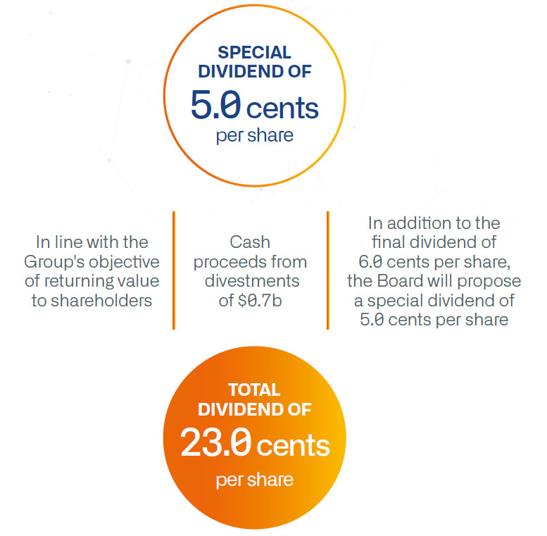 The Board has proposed a final dividend of 6.0 cents per share and a special dividend of 5.0 cents per share, subject to shareholder approval at the 2026 AGM. Including the interim dividends of 12.0 cents per ordinary share paid for FY2025, the total dividend for FY2025 will be 23.0 cents per share.