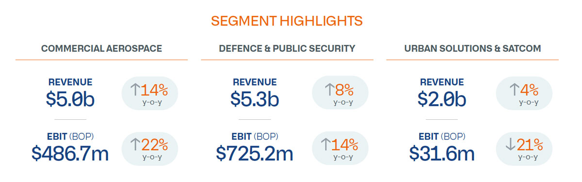 On a base operating performance (BOP)1 basis, however, 2025 was a strong year, with the Group reaching new highs in revenue and profits, reflecting the underlying strengths of our businesses. Group Revenue grew 9% year-on-year (y-o-y) to $12.35b from $11.28b, with contributions from all three segments - Commercial Aerospace, Defence & Public Security and Urban Solutions & Satcom. Group BOP EBIT rose 16% y-o-y to $1.24b from $1.08b, while Group BOP PBT crossed the $1b mark, increasing 20% to $1.04b from $863m. Group BOP Net Profit grew 21% to $851m from $702m the year before.