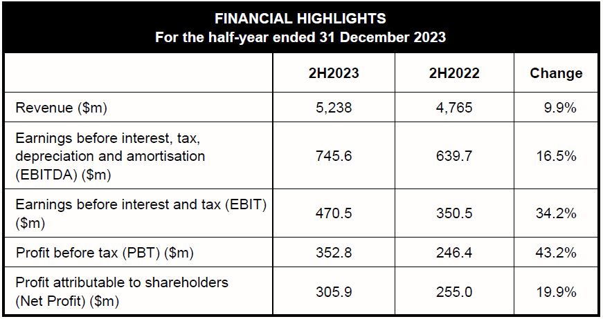 In 2H2023, Group revenue grew 10% y-o-y to $5.2b from $4.8b due largely to the growth of Commercial Aerospace. Group EBIT increased 34% to $470m from $351m through business growth and cost saving initiatives. Group PBT was up 43% to $353m from $246m. Group Net Profit rose 20% y-o-y to $306m from $255m, bolstered by strong business growth, higher productivity and cost savings.